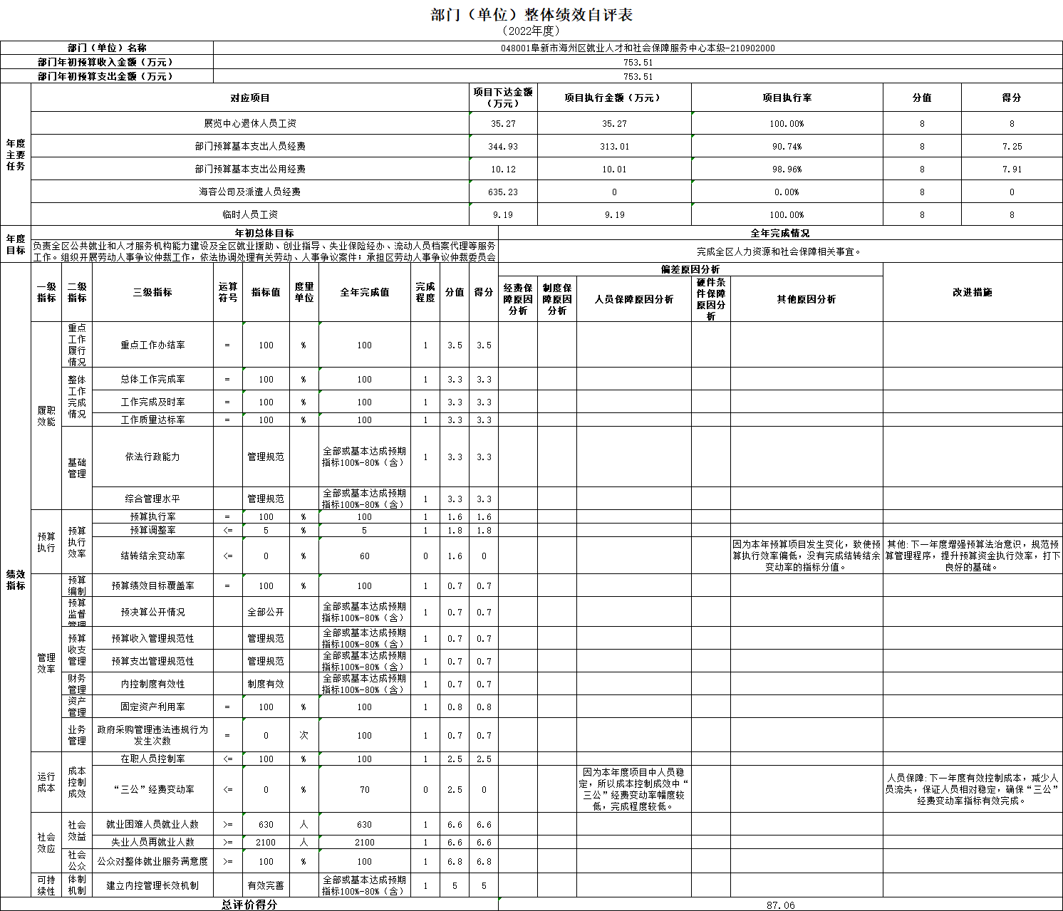 组织对1个单位开展整体绩效自评,涉及资金753.51万元,自评平均分87.06分。《部门(单位)整体绩效自评表》见附件。