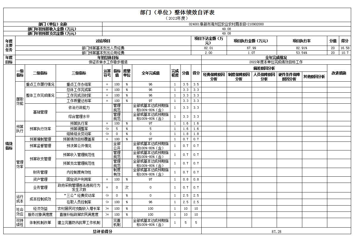 组织对1个单位开展整体绩效自评,涉及资金49.08万元,自评平均分87.28分。《部门(单位)整体绩效自评表》见附件。