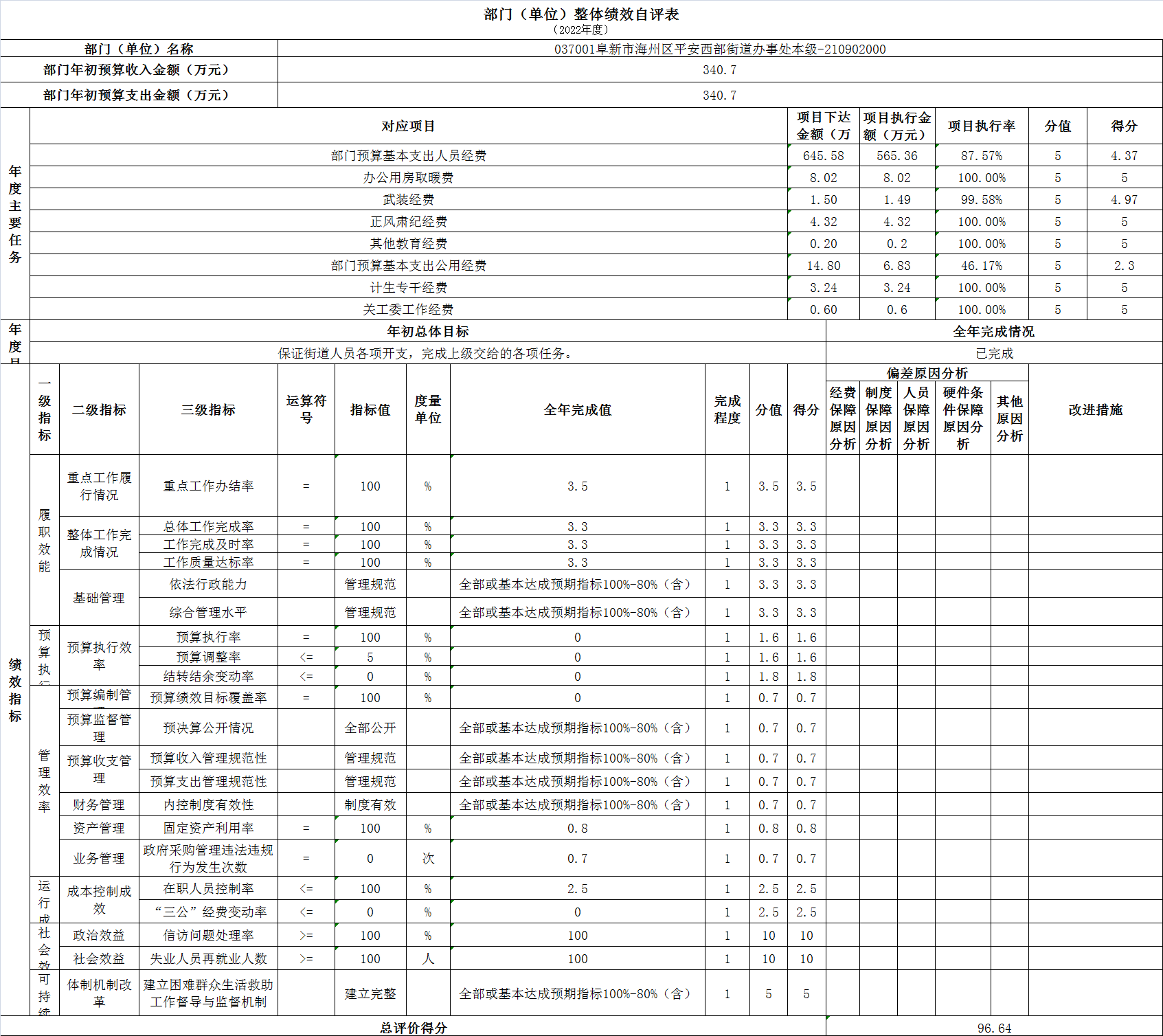 组织对1个单位开展整体绩效自评,涉及资金340.7万元,自评平均分96.64分。《部门(单位)整体绩效自评表》见附表。