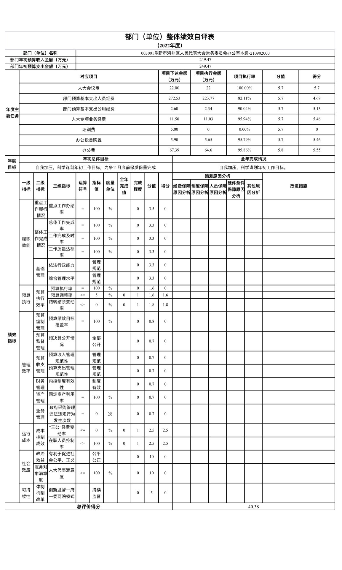 组织对1个单位开展整体绩效自评,涉及资金59.5万元,自评平均分40.38分。《部门(单位)整体绩效自评表》见附件。