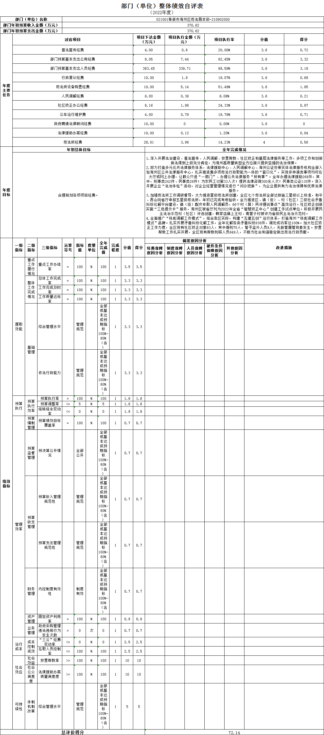组织对1个单位开展整体绩效自评,涉及资金370.62万元,自评平均分72.14分。《部门(单位)整体绩效自评表》见附件。