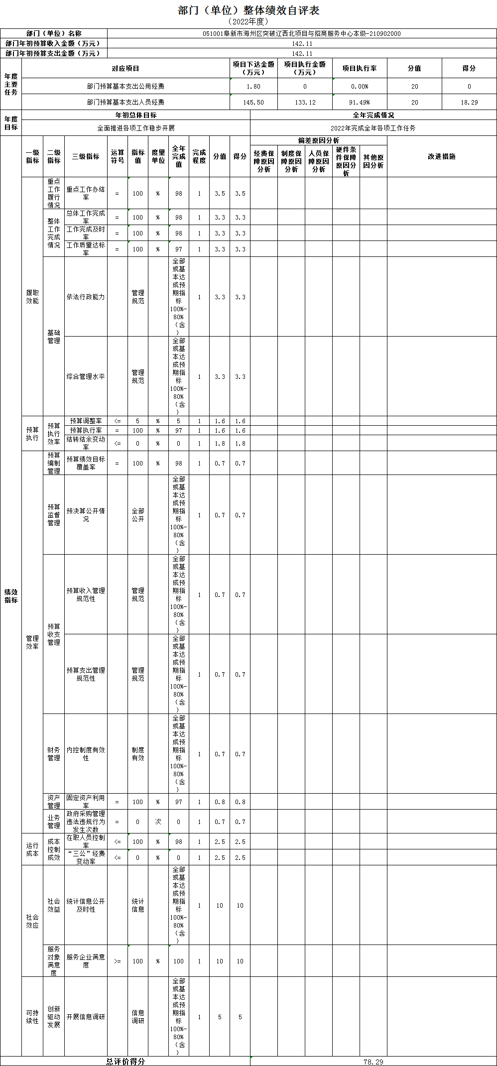 组织对1个单位开展整体绩效自评,涉及资金147.3万元,自评平均分78.29分。《部门(单位)整体绩效自评表》见附件。