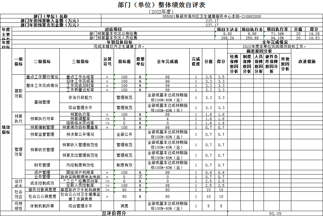 组织对1个单位开展整体绩效自评,涉及资金237.17万元,自评平均分93.09分。《部门(单位)整体绩效自评表》见附件。