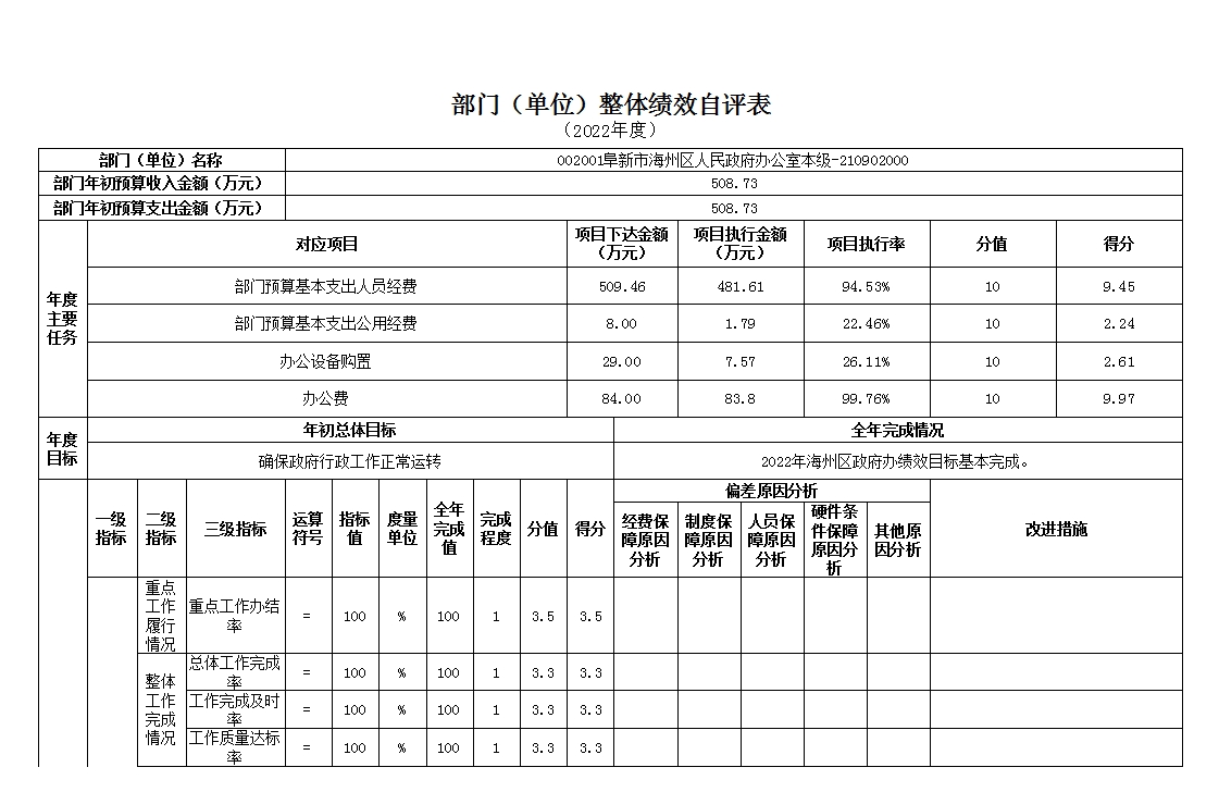组织对1个单位开展整体绩效自评,涉及资金508.73万元,自评平均分84.27分。《部门(单位)整体绩效自评表》见附件。