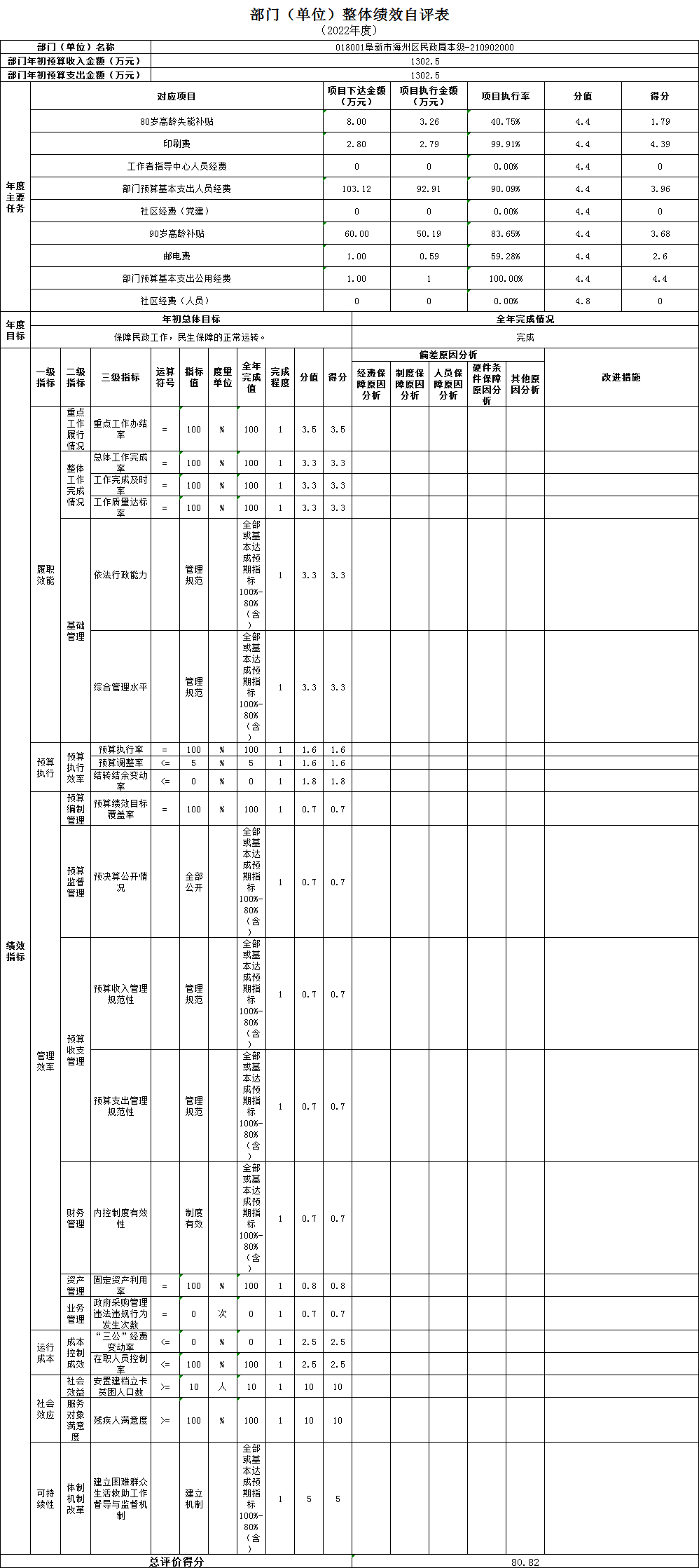 组织对1个单位开展整体绩效自评,涉及资金1302.5万元,自评平均分80.82分。《部门(单位)整体绩效自评表》见附件。
