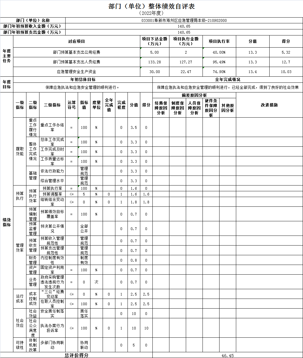 组织对1个单位开展整体绩效自评,涉及资金 140.65万元,自评平均分46.45分。《部门(单位)整体绩效自评表》见附件。