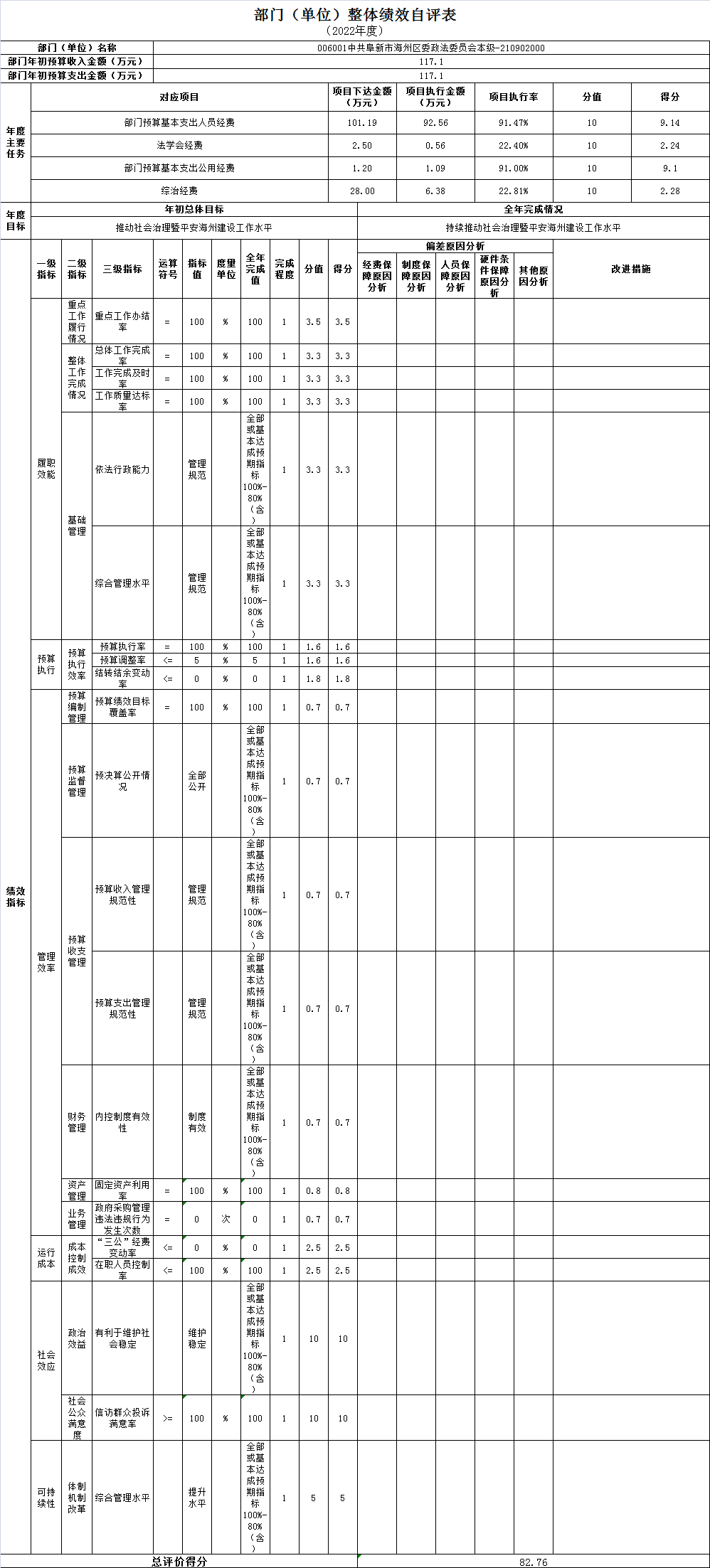 组织对1个单位开展整体绩效自评,涉及资金117.1万元,自评平均分82.76分。《部门(单位)整体绩效自评表》见附件。