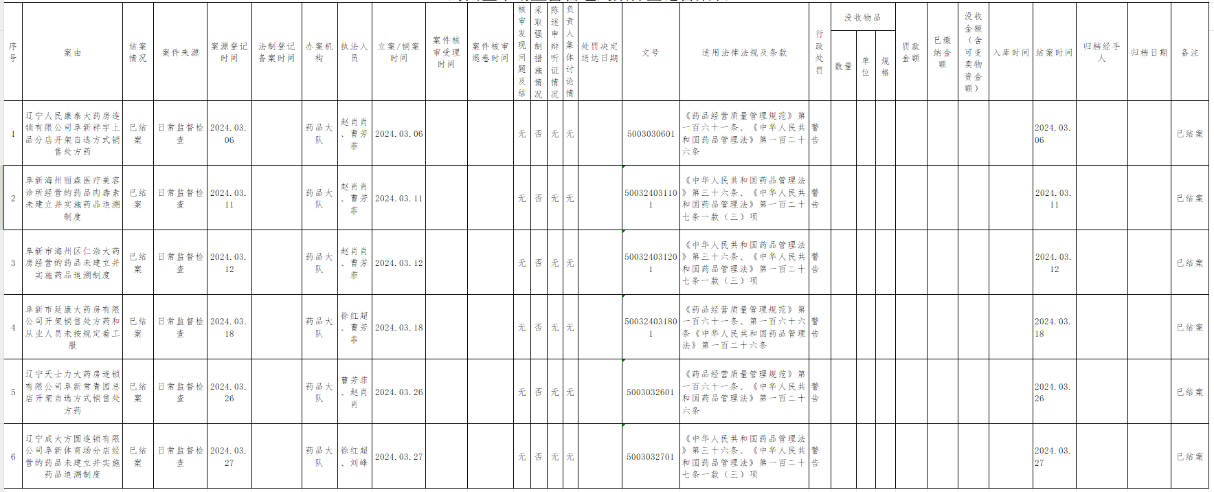 海州区市场局2024年3月份药品监管行政处罚案件公示表