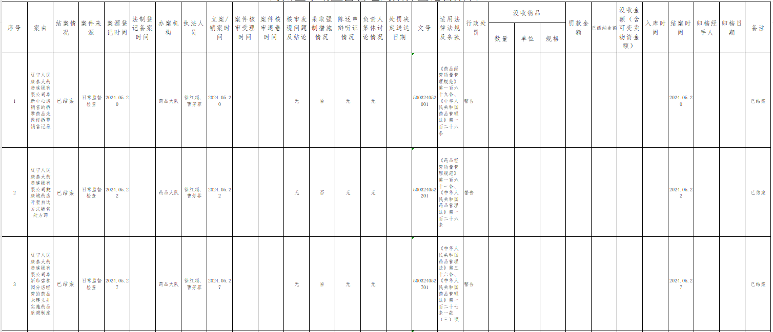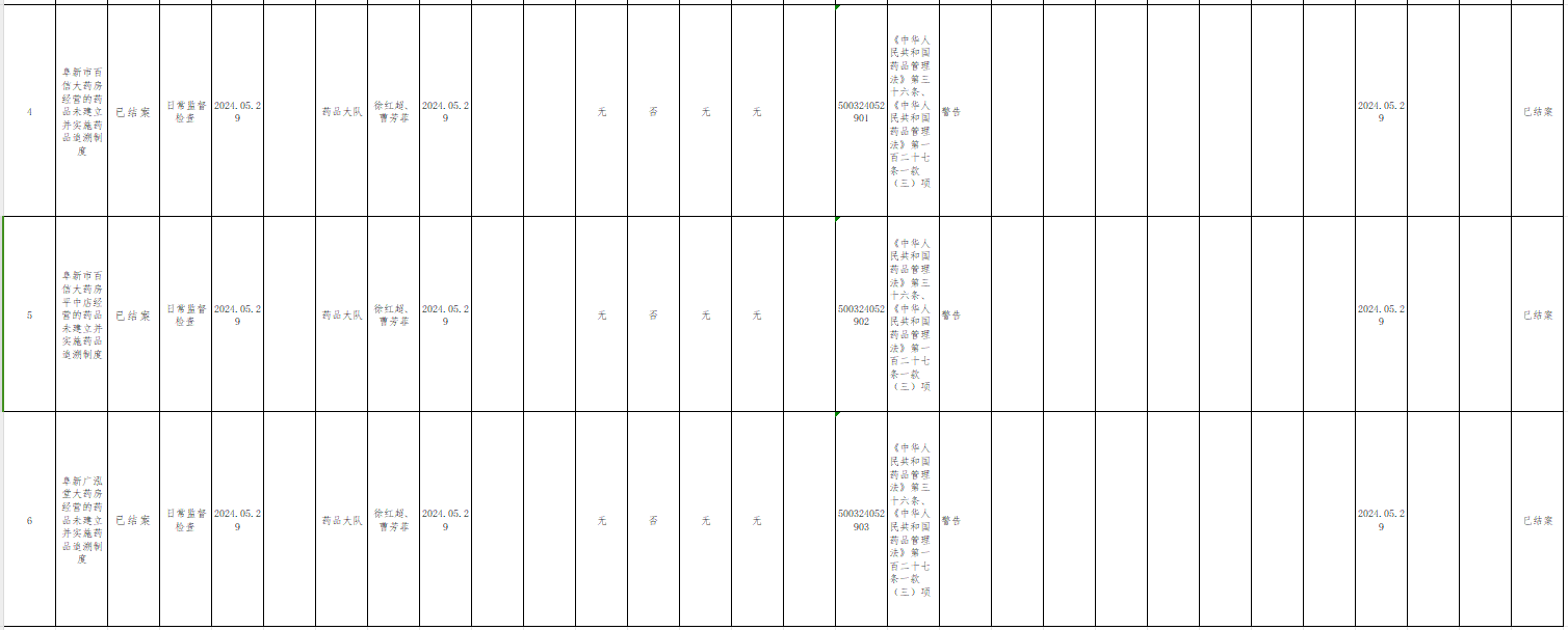 海州区市场局2024年5月份药品监管行政处罚案件公示表