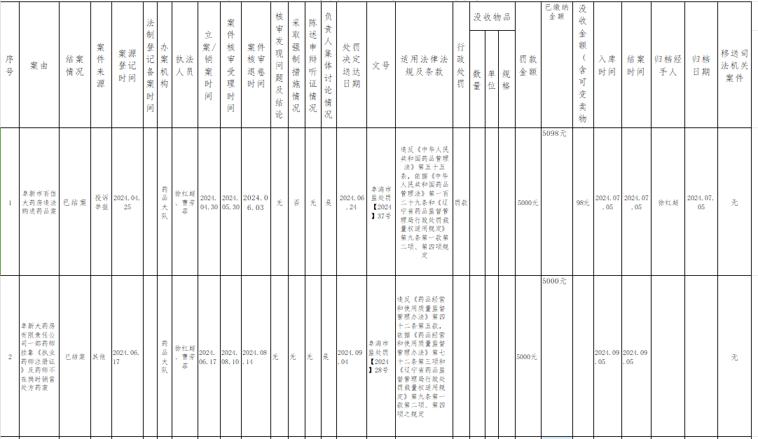 海州区市场局2024年7月药品监管行政处罚案件公示表