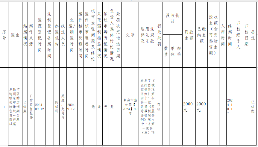 海州区市场局2024年医疗器械10月份监管行政处罚案件公示表
