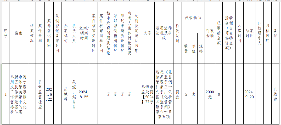 海州区市场局2024年化妆品监管9月份行政处罚案件公示表