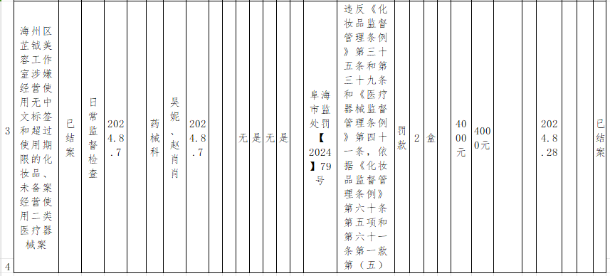 海州区市场局2024年化妆品监管8月份行政处罚案件公示表