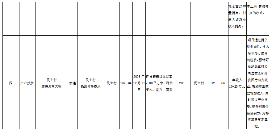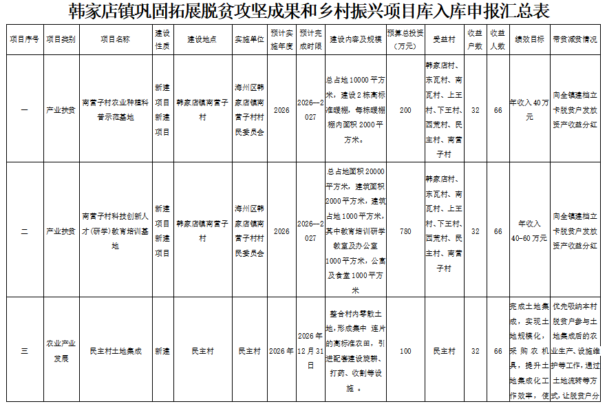 根据中共辽宁省委办公厅 辽宁省人民政府办公厅关于印发《辽宁省实现巩固拓展脱贫攻坚成果同乡村振兴有效衔接实施方案》的通知(辽委办发〔2021〕10号)文件要求,报请中共海州区委农村工作领导小组同意,拟将韩家店镇南营子村农业种植科普示范基地、南营子村科技创新人才(研学)教育培训基地、民主村土地集成、民主村玻璃温室大棚4个项目纳入2026年巩固拓展脱贫攻坚成果和乡村振兴项目库。现予以公示。
